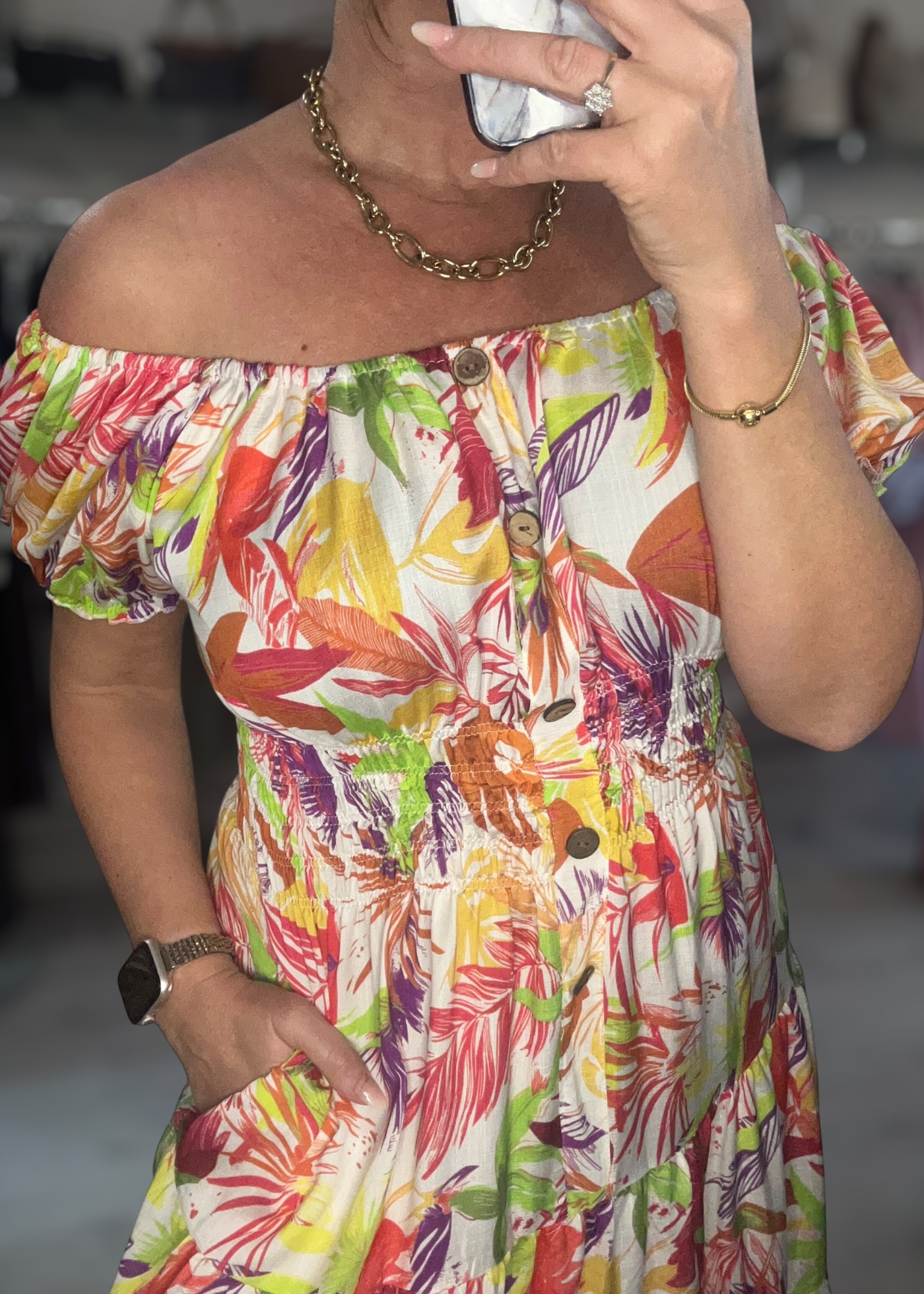 Gorgeous midi dress with deep shirred waist ...faux button detail and stretch neckline and sleeve