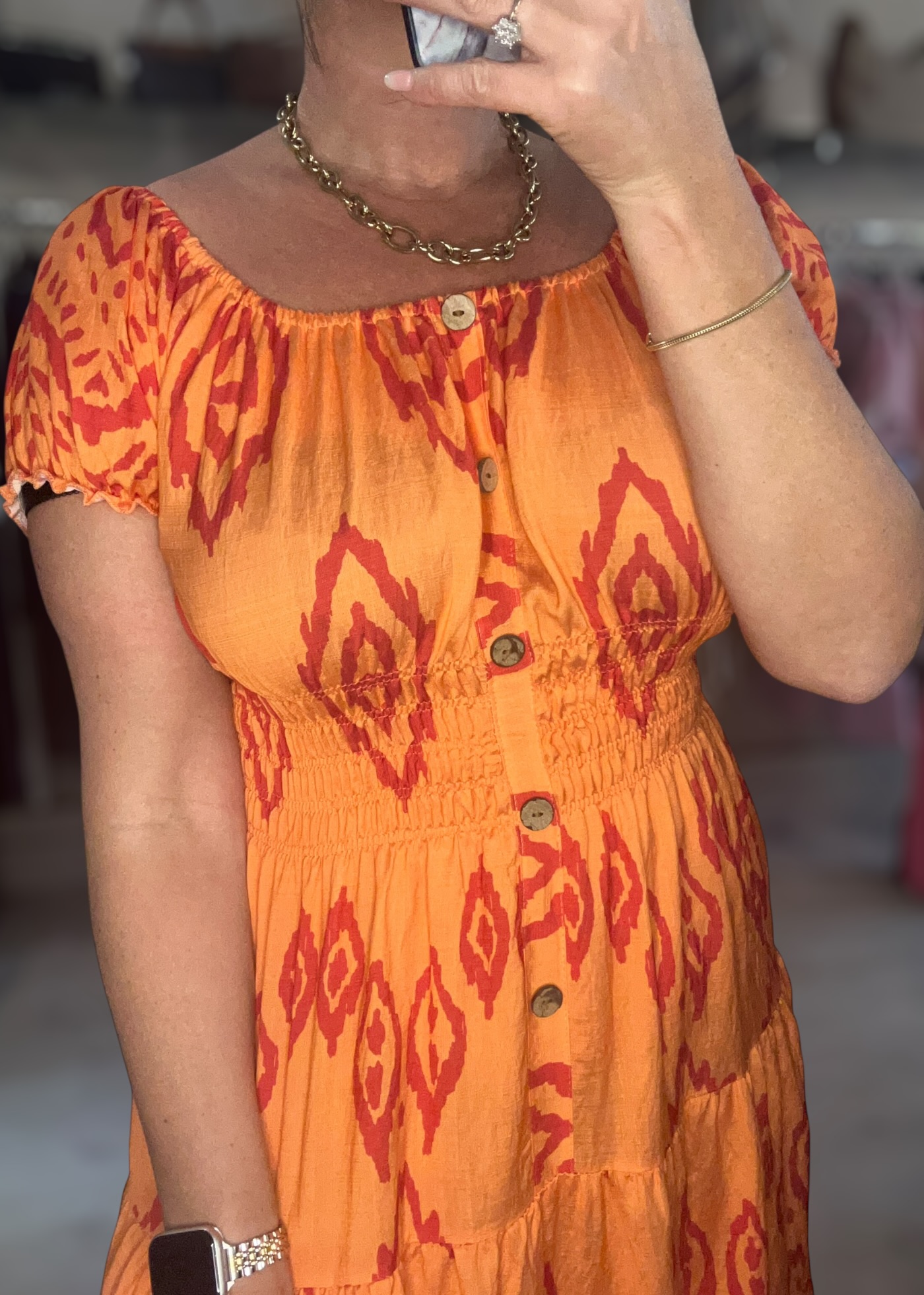 Gorgeous midi dress with deep shirred waist ...faux button detail and stretch neckline and sleeve