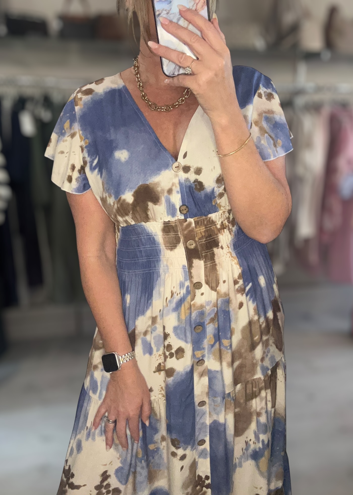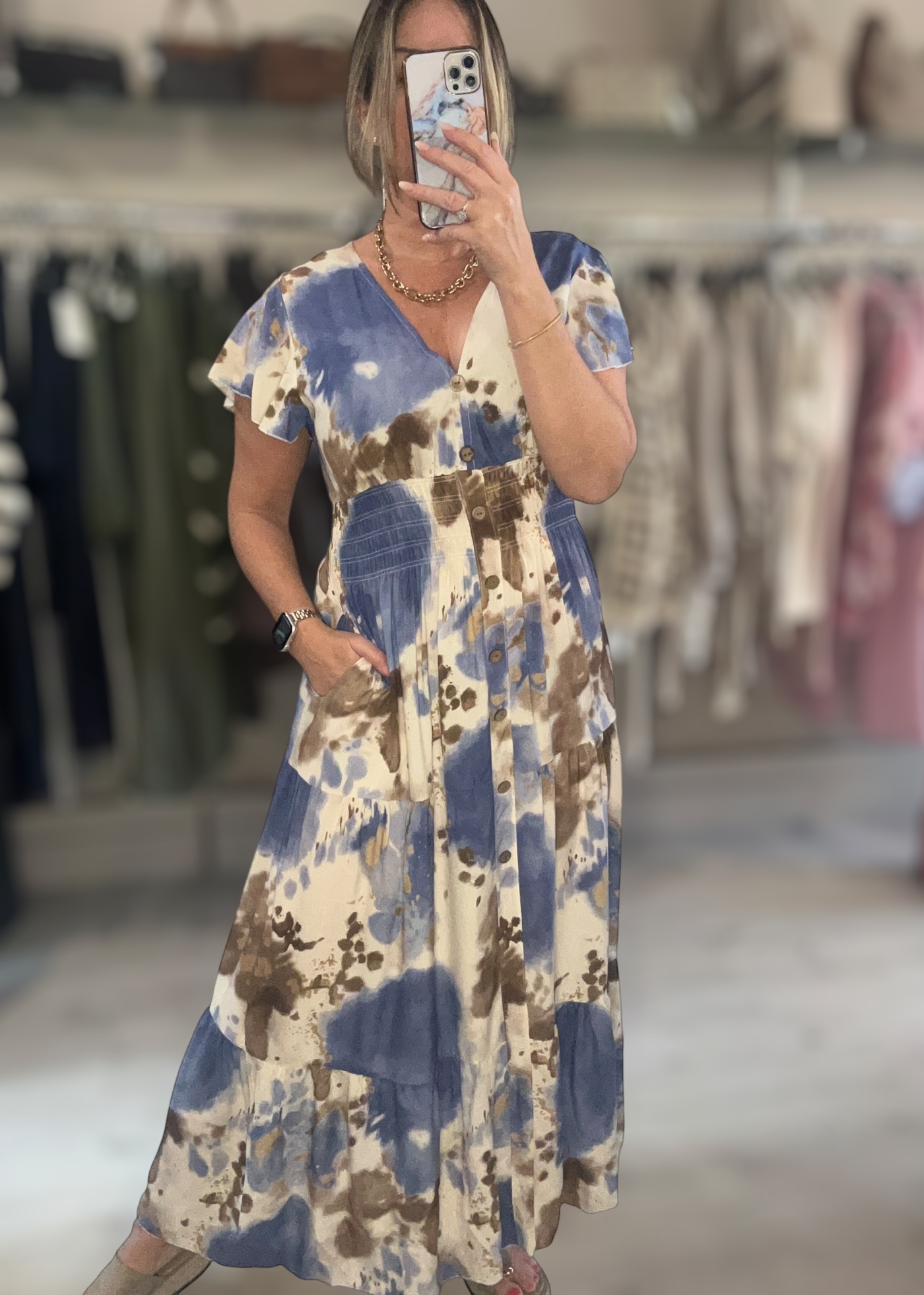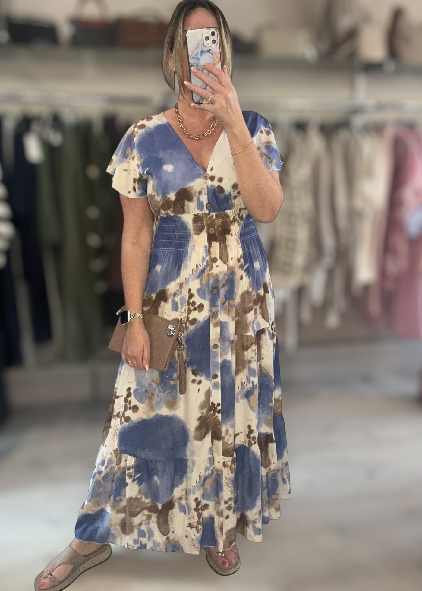 Beautiful spring summer maxi dress with deep shirred stretch waist and faux button detail