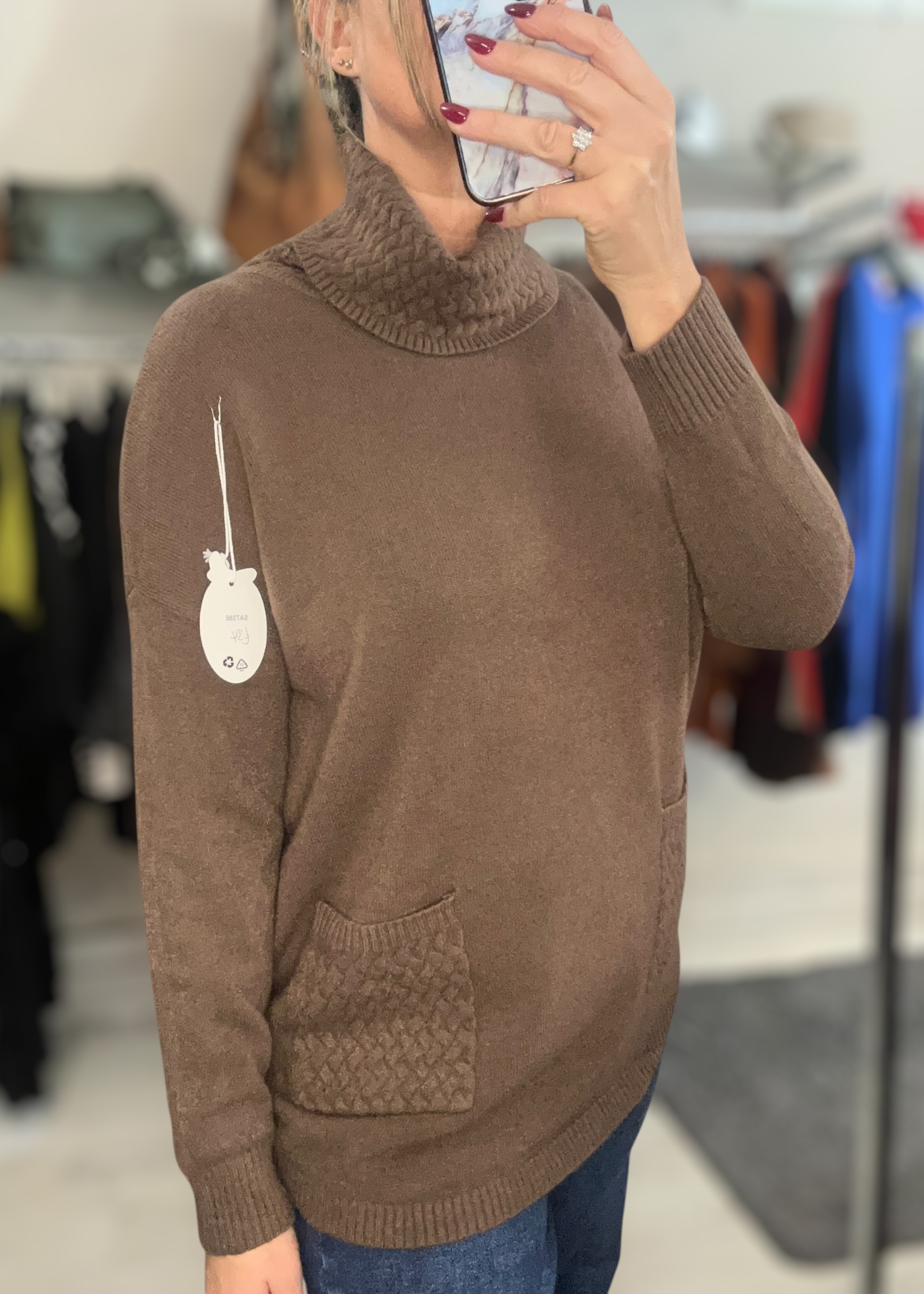 Soft touch fine knit with textured roll neck and 2 front pockets