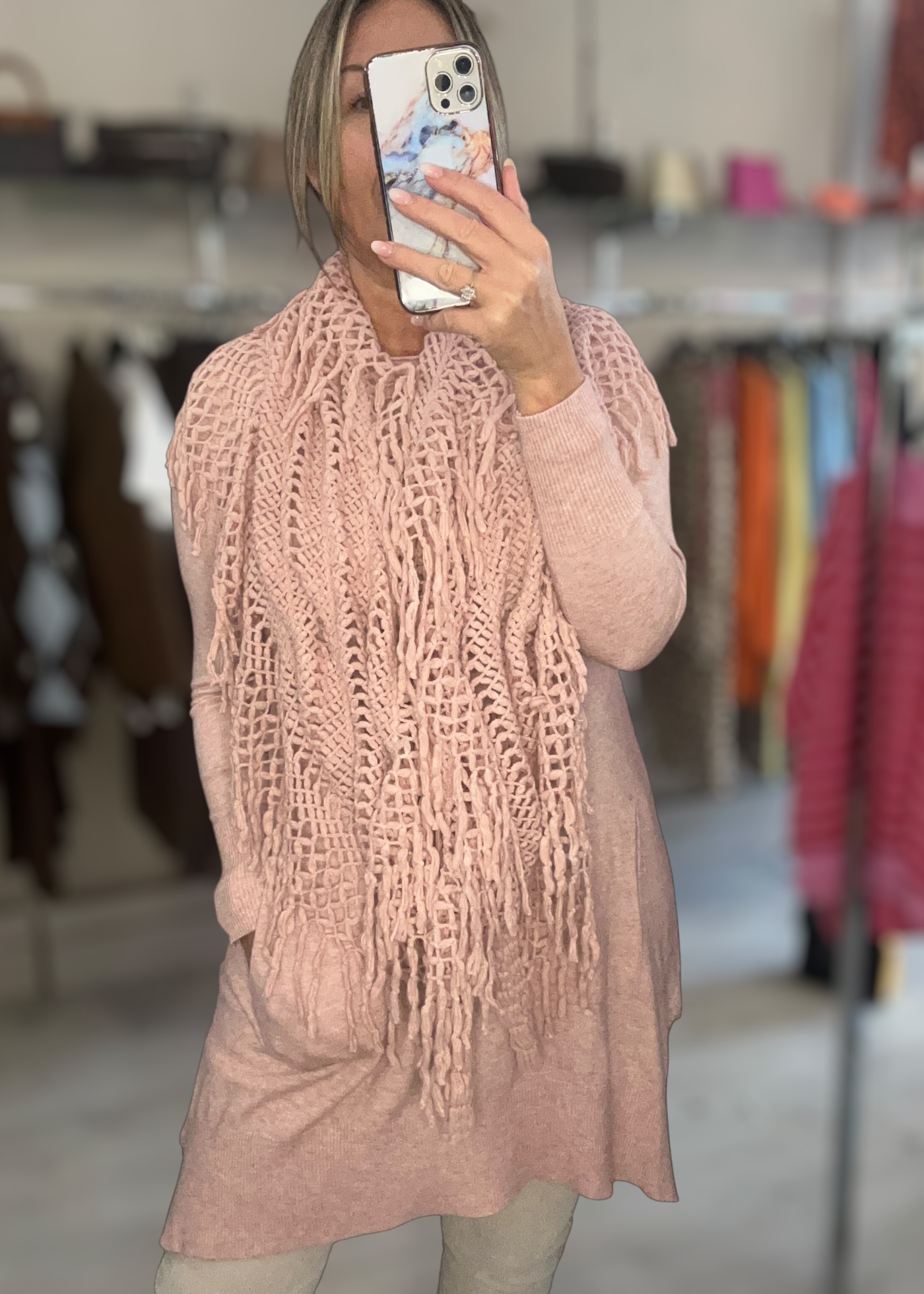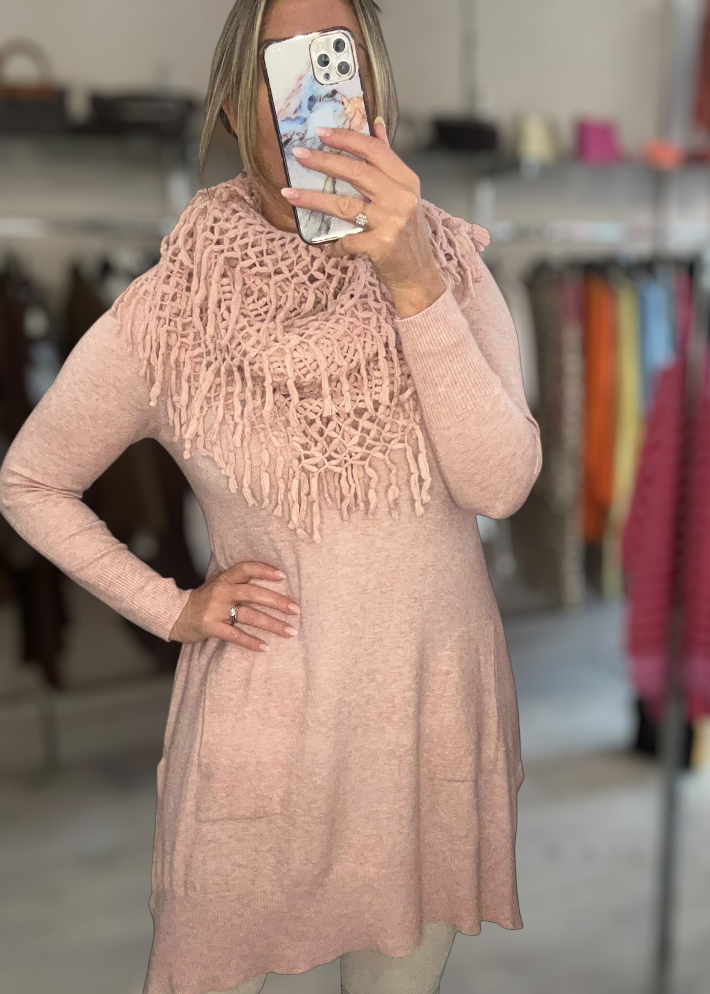 matching removable crochet scarf which can be work long short round the neckline matching removable or not at all