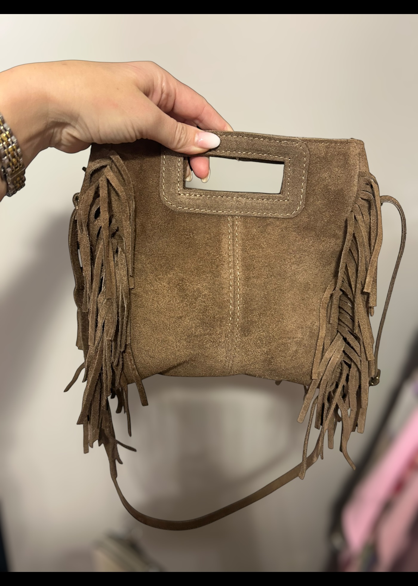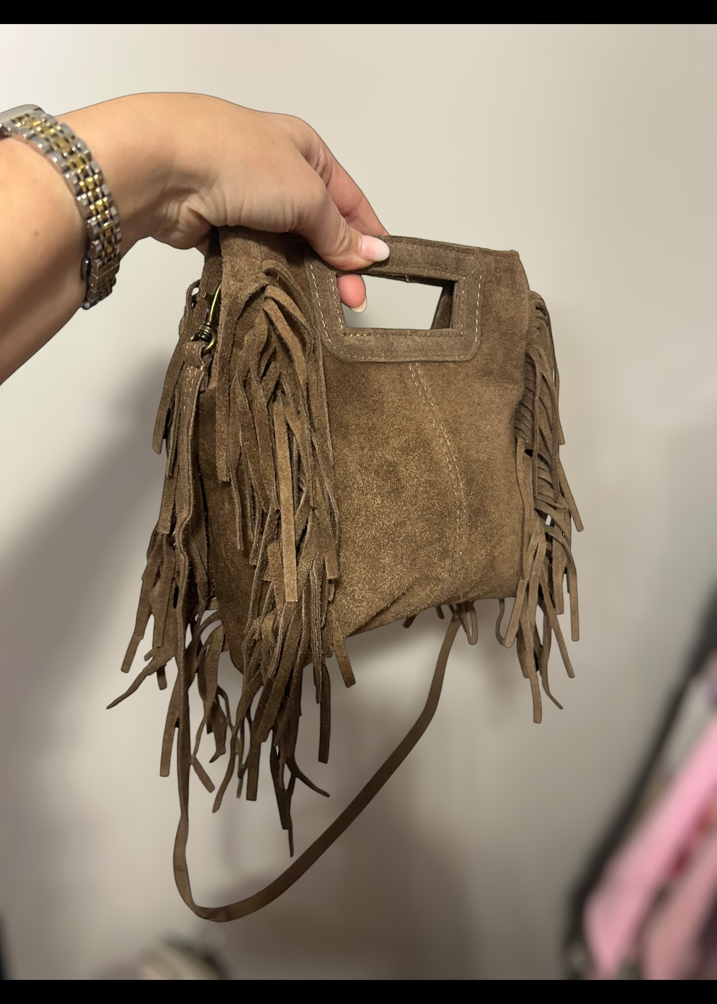 Small suede fringed bag with grab handle and removable and adjustable long strap