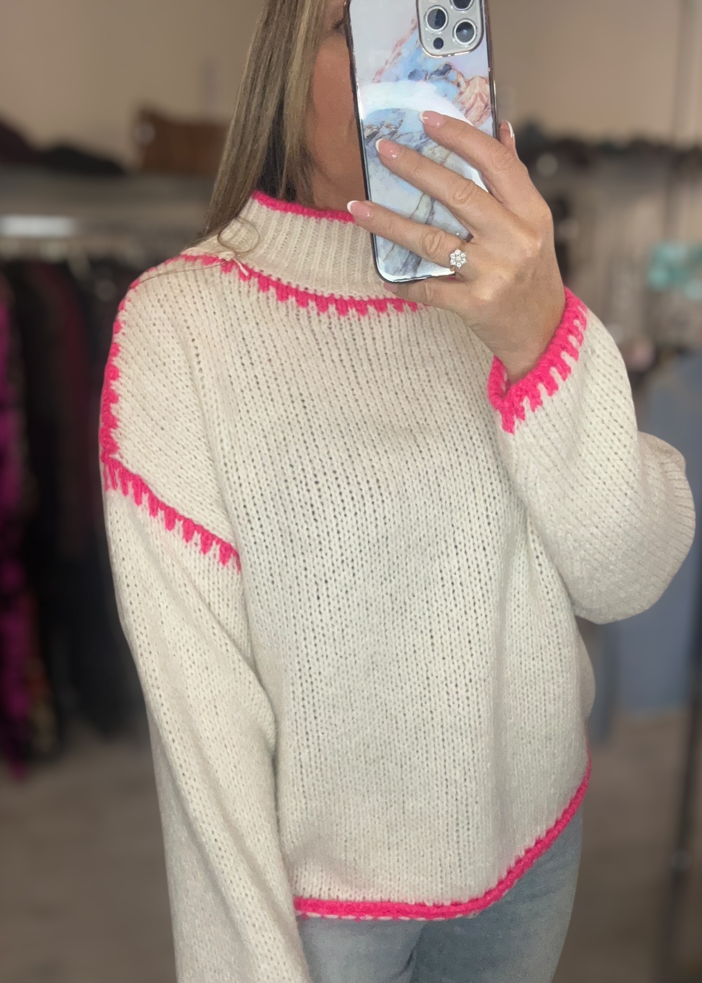 Chunky slouchy knit with blanket stitch detail