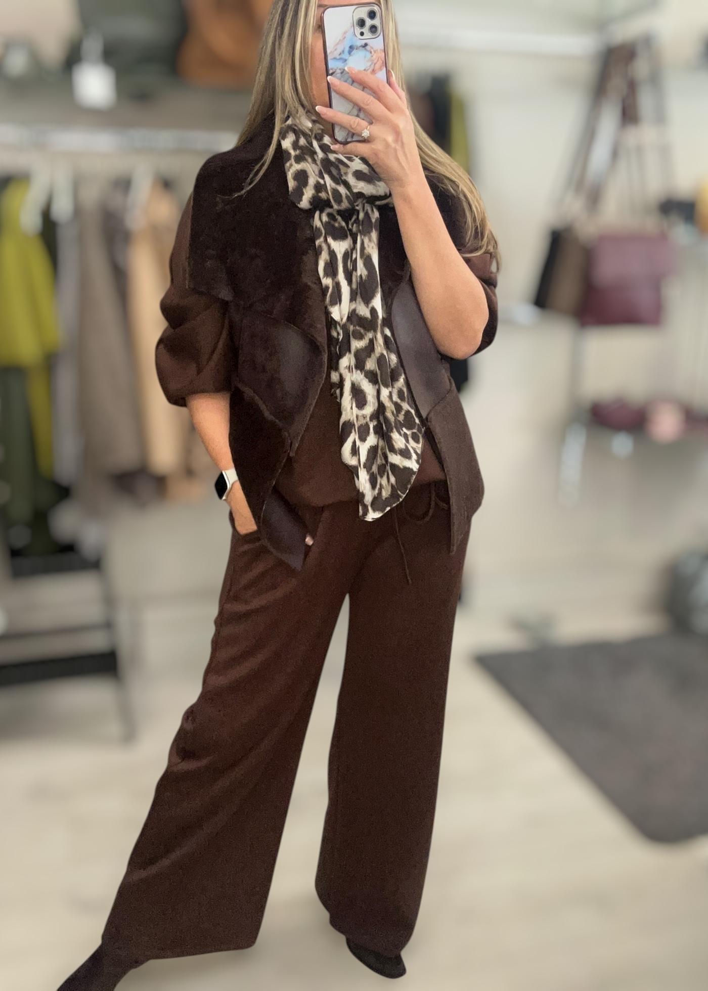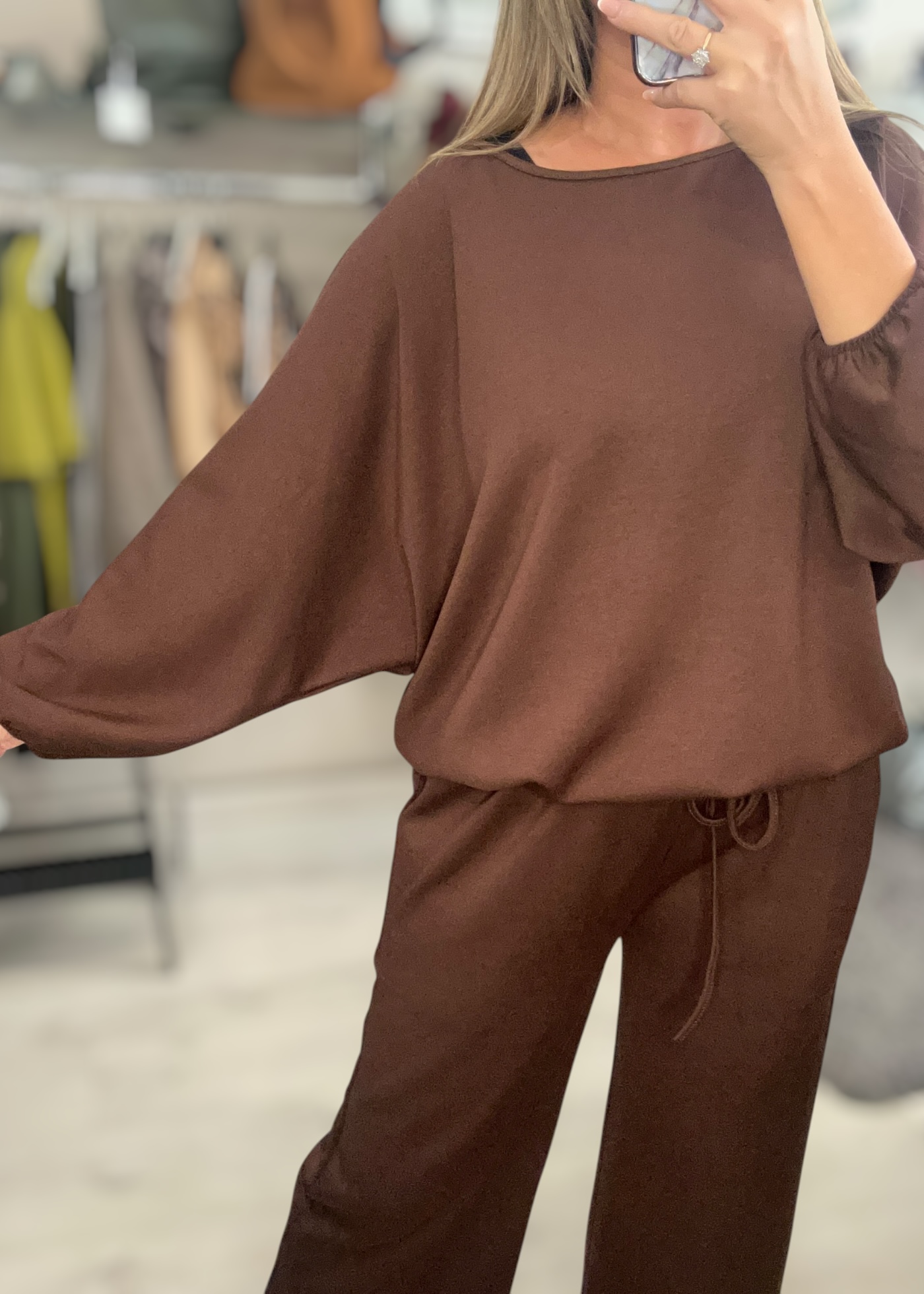 Co-ord set including wide leg trouser and long sleeve matching top in gorgeous soft stretchy sports luxe fabric