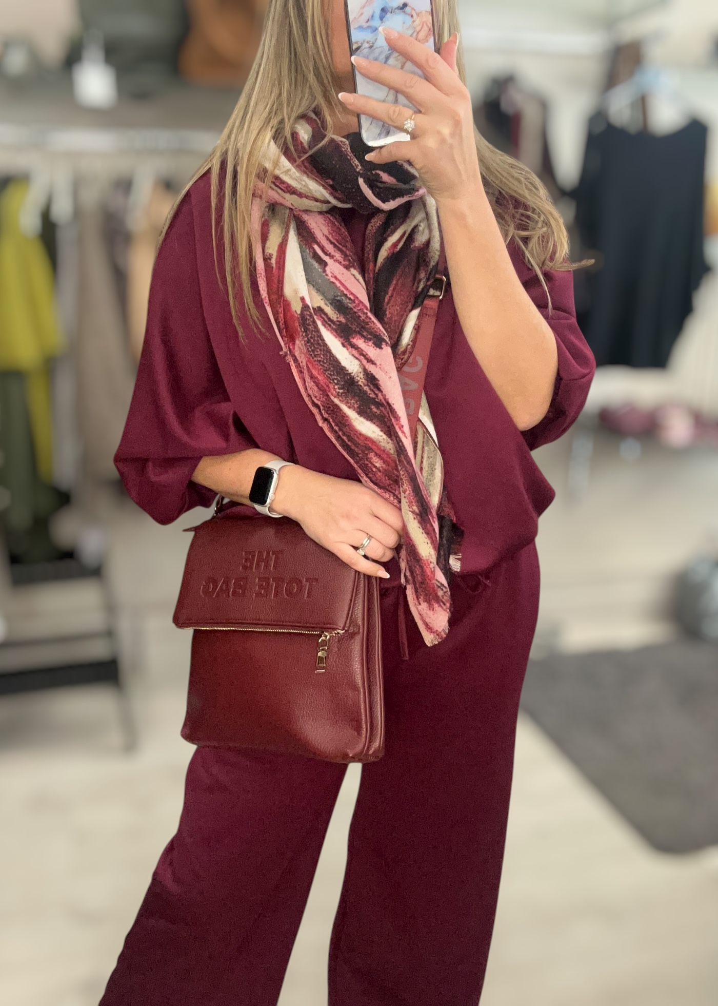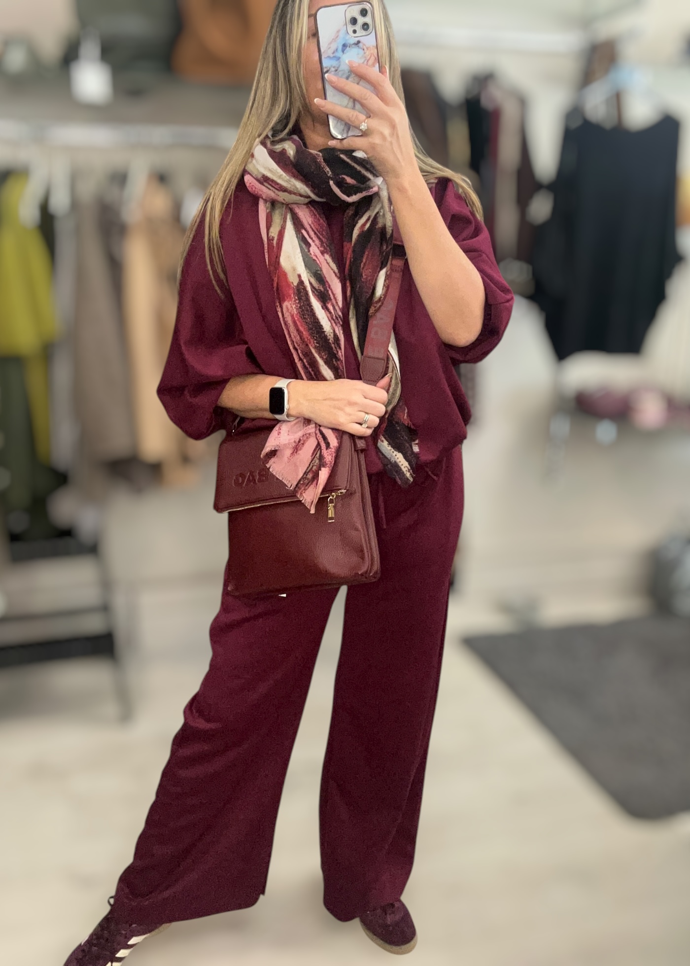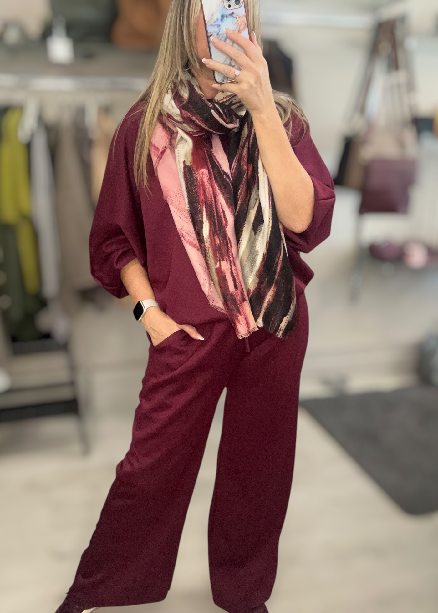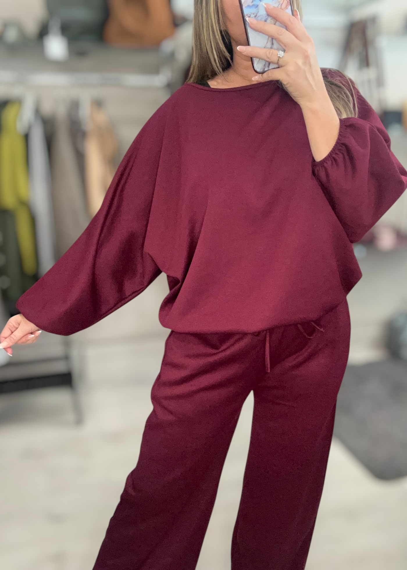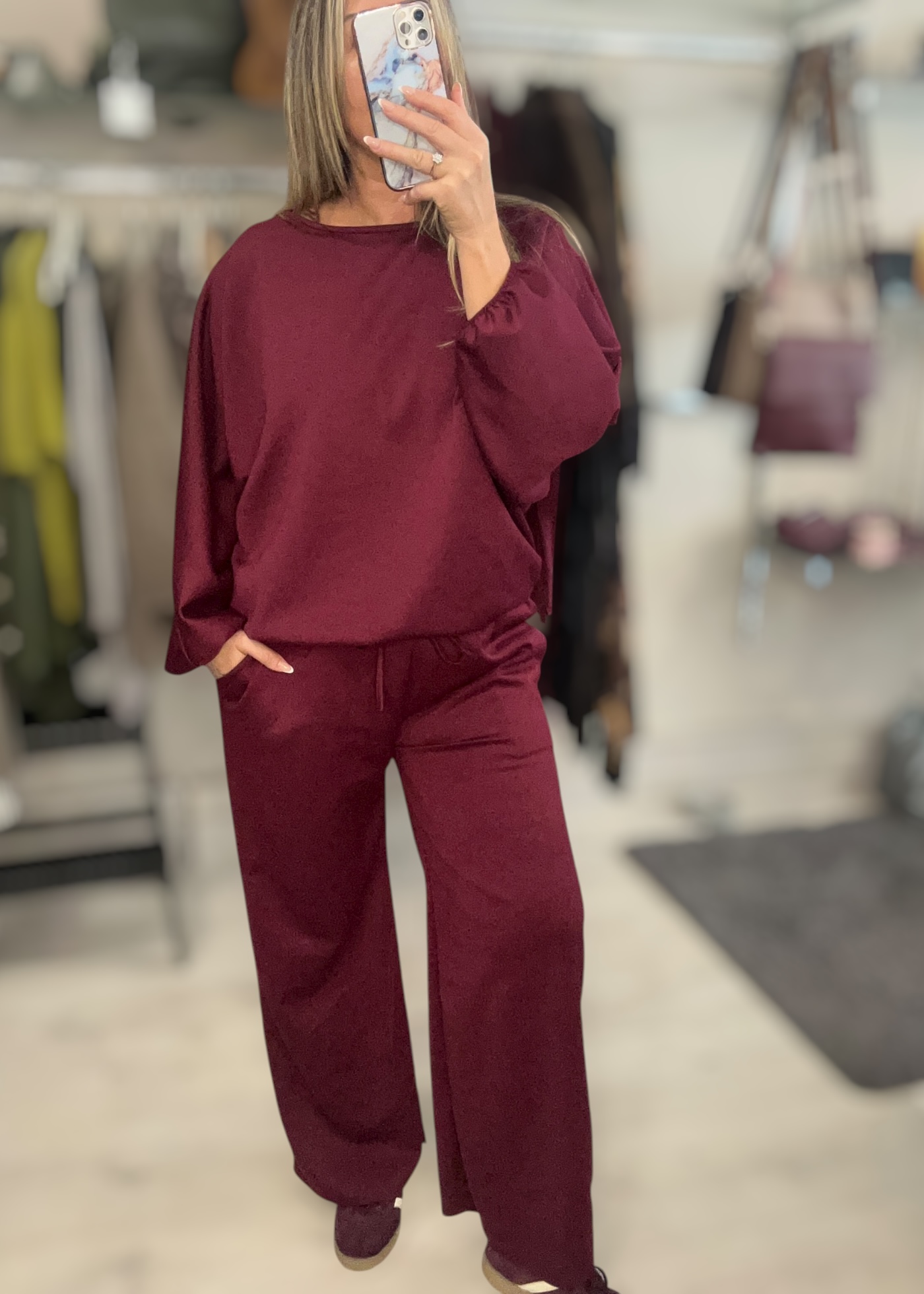 Co-ord set including wide leg trouser and long sleeve matching top in gorgeous soft stretchy sports luxe fabric