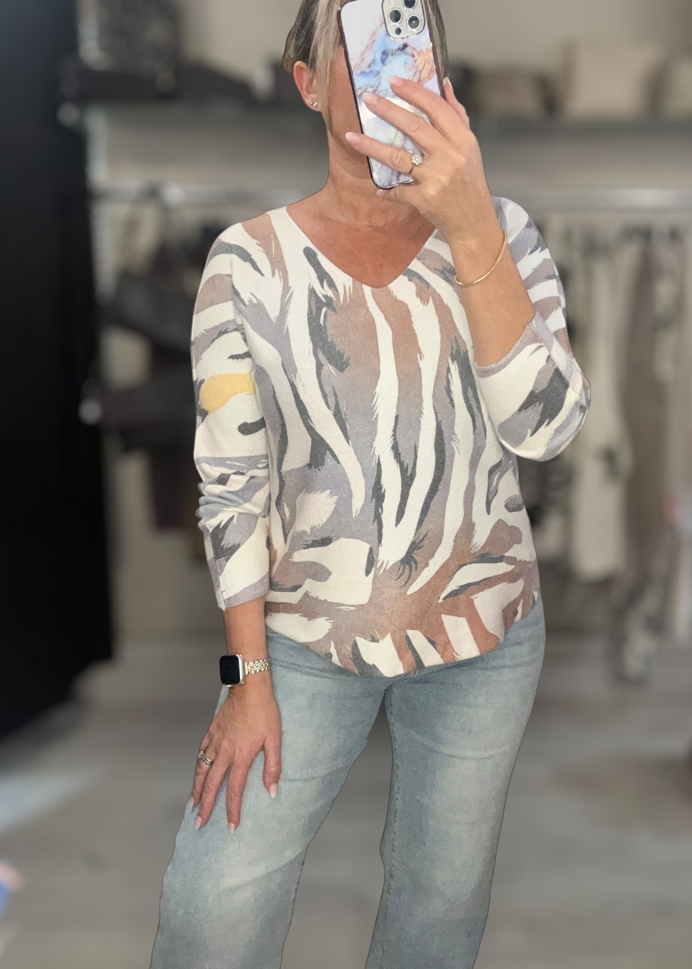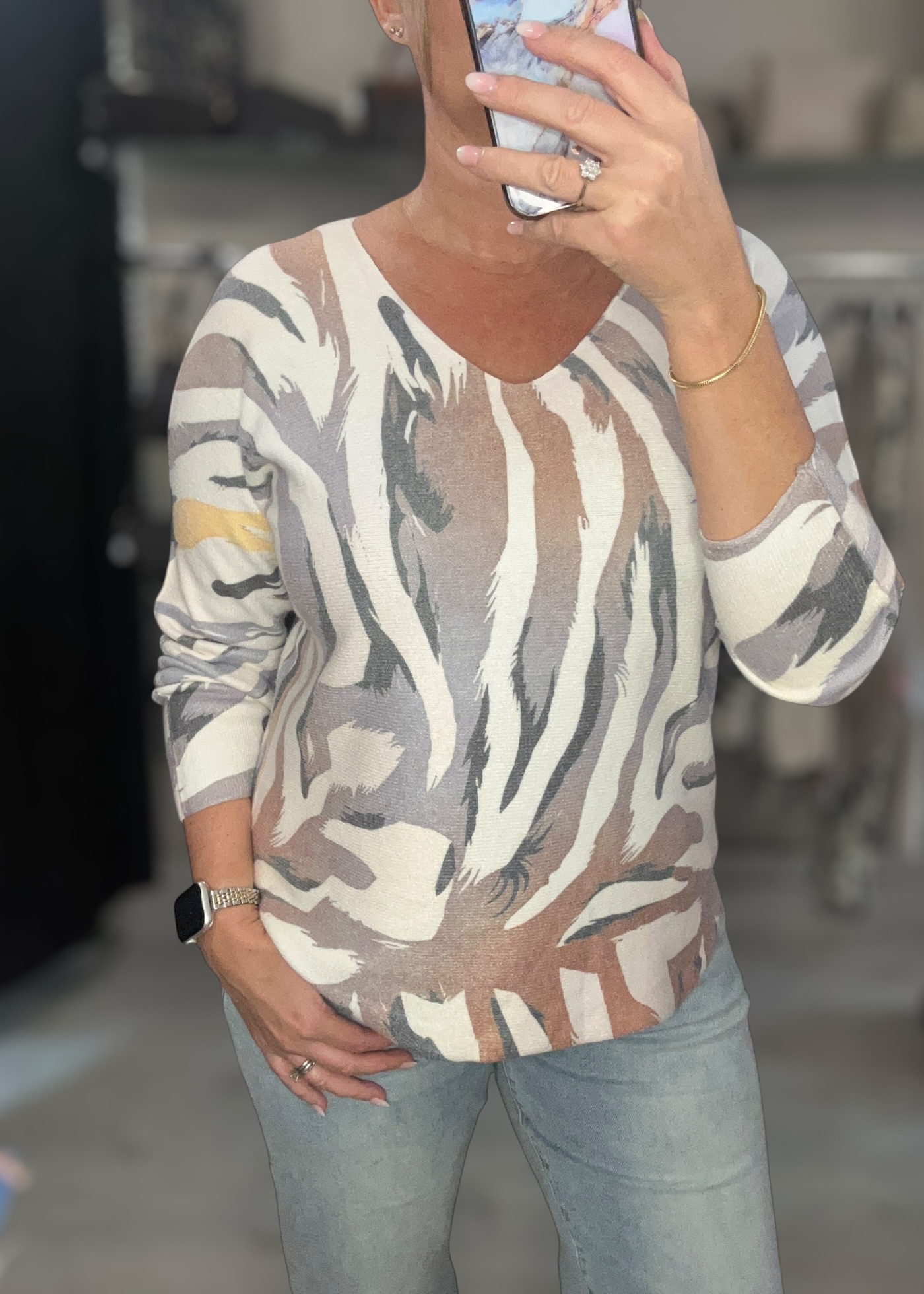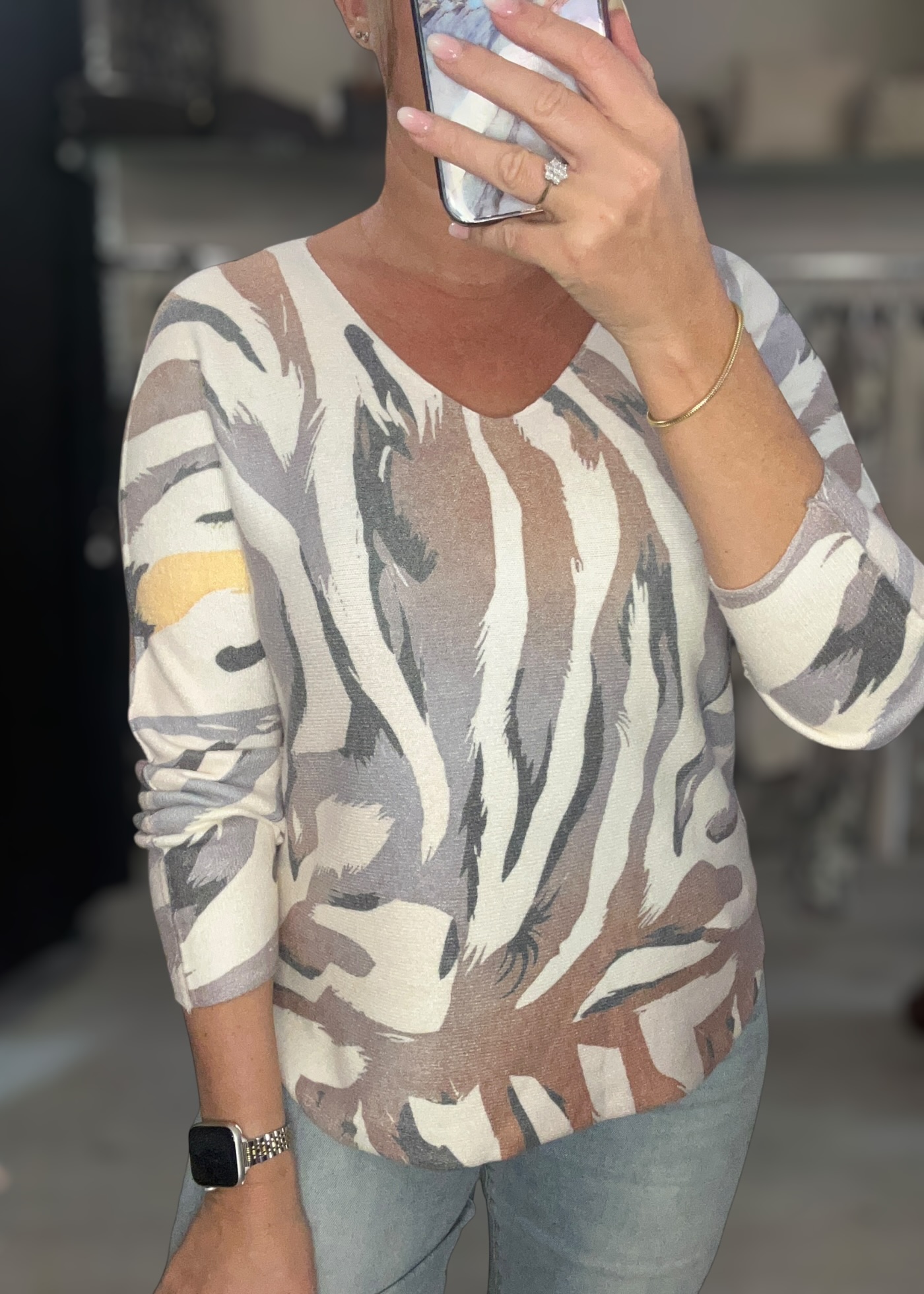 Lightweight printed fine knit with v neckline and long sleeves
