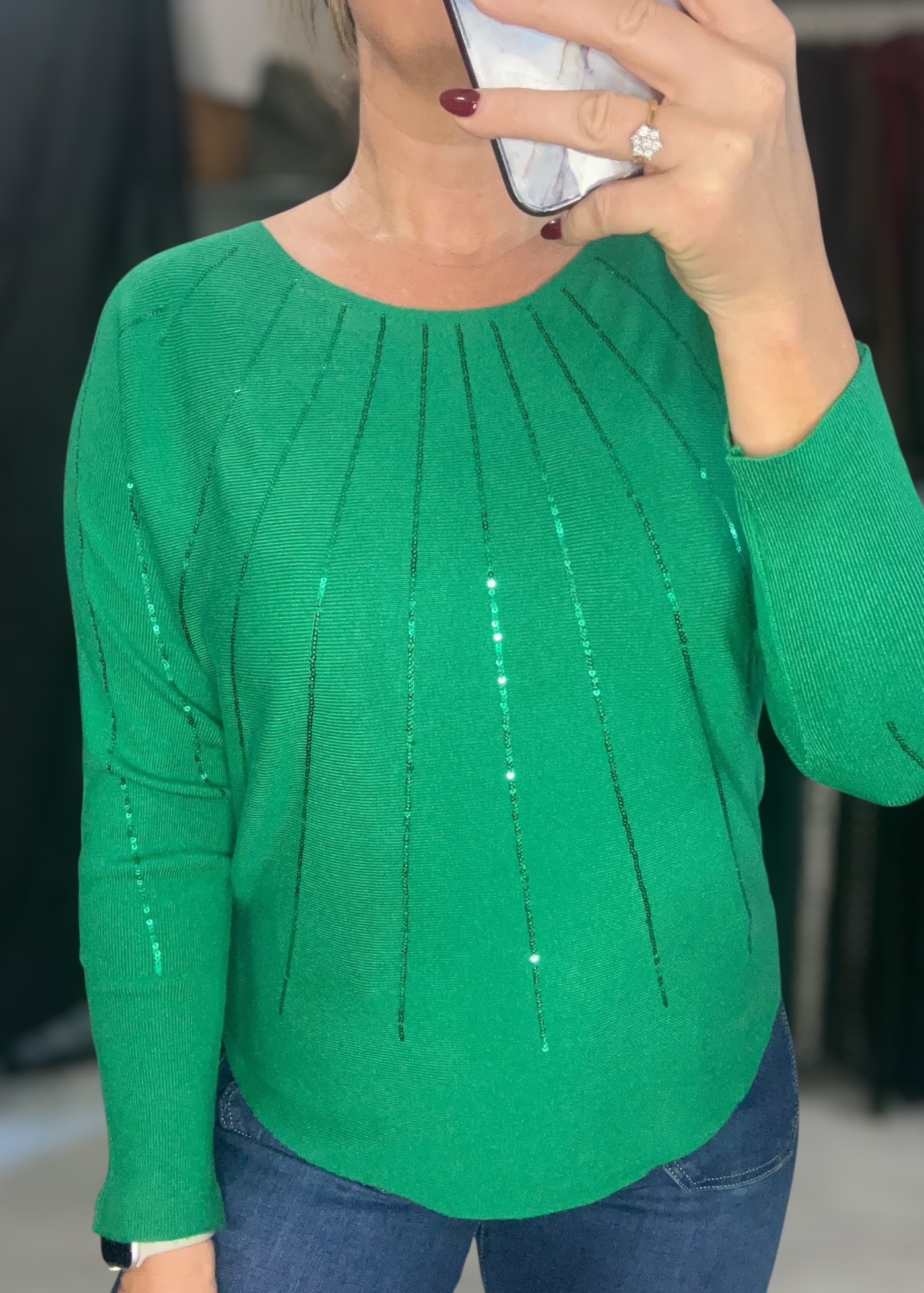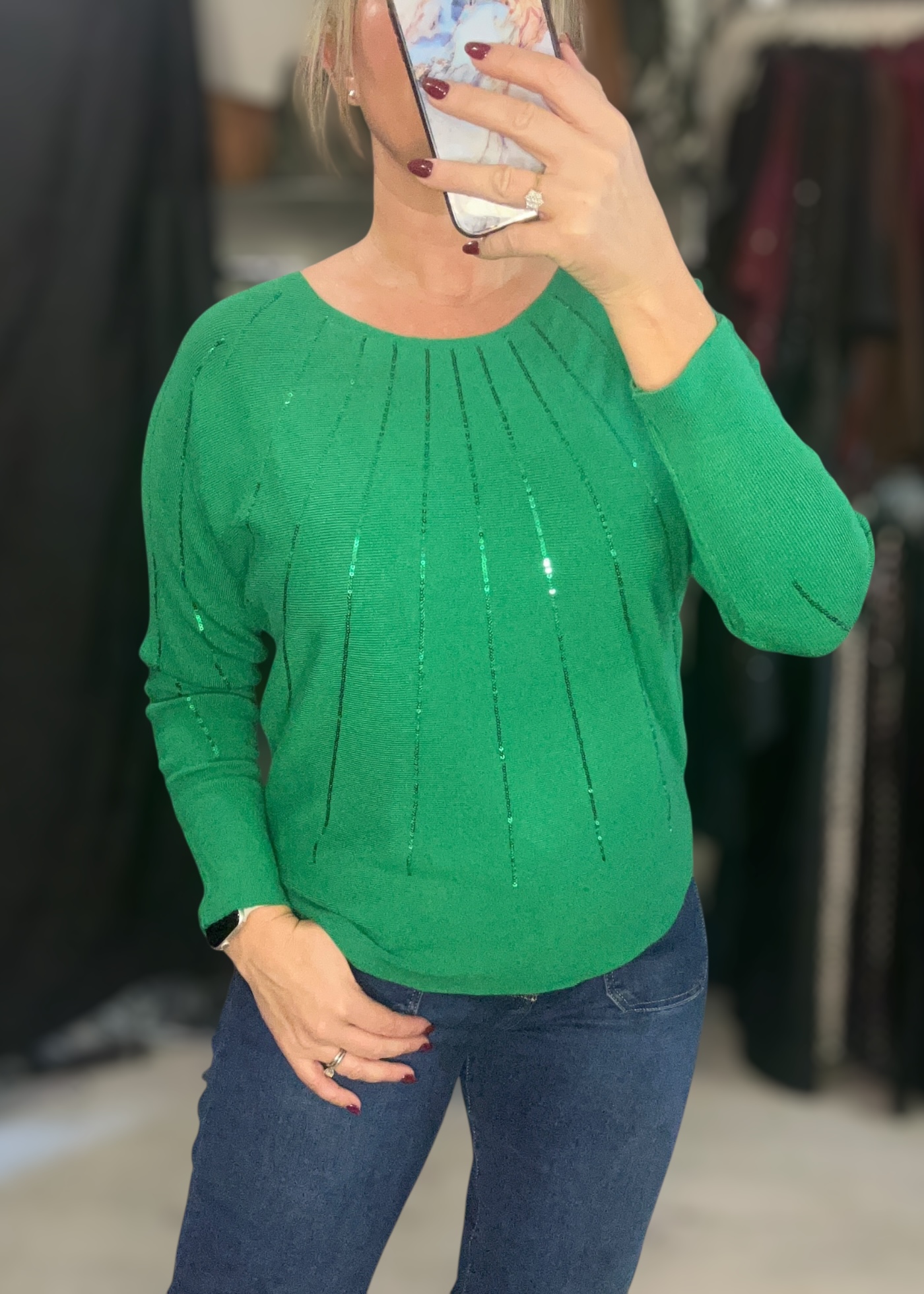 Soft fine knit with linear sequin detail to front and to sleeves