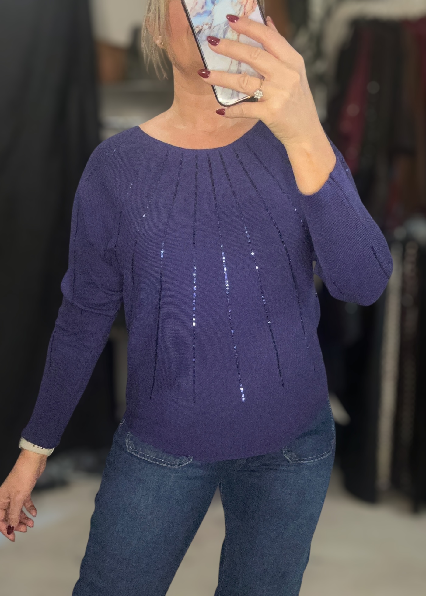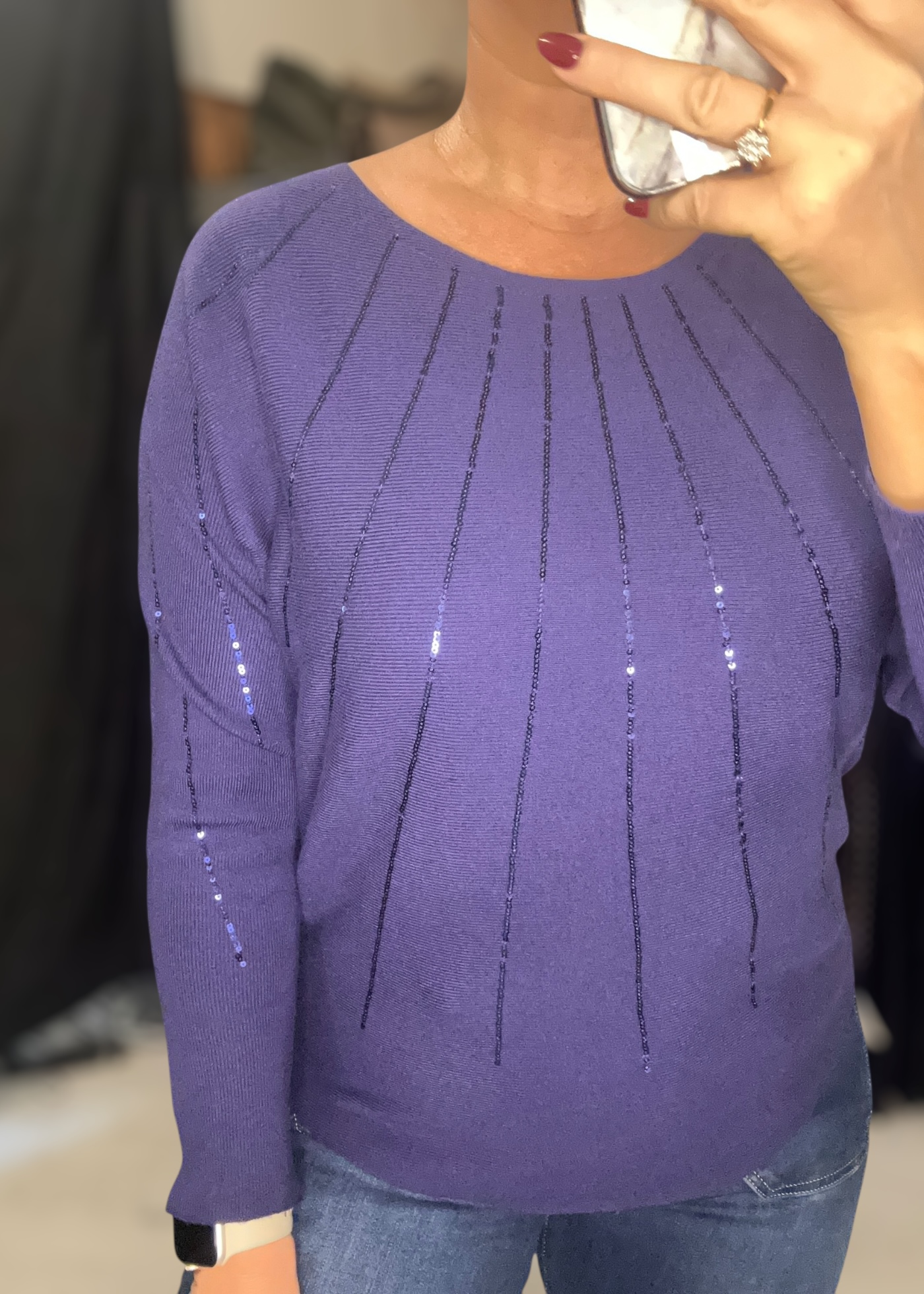 Soft fine knit with linear sequin detail to front and to sleeves