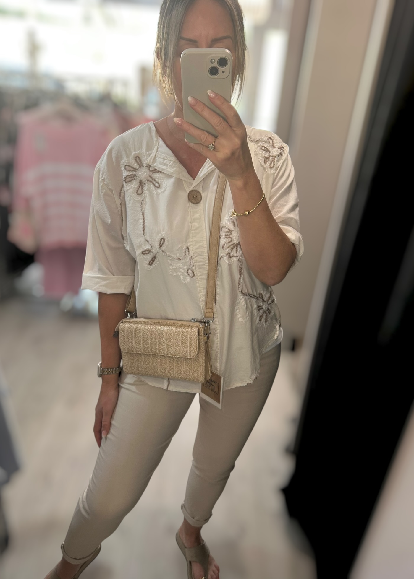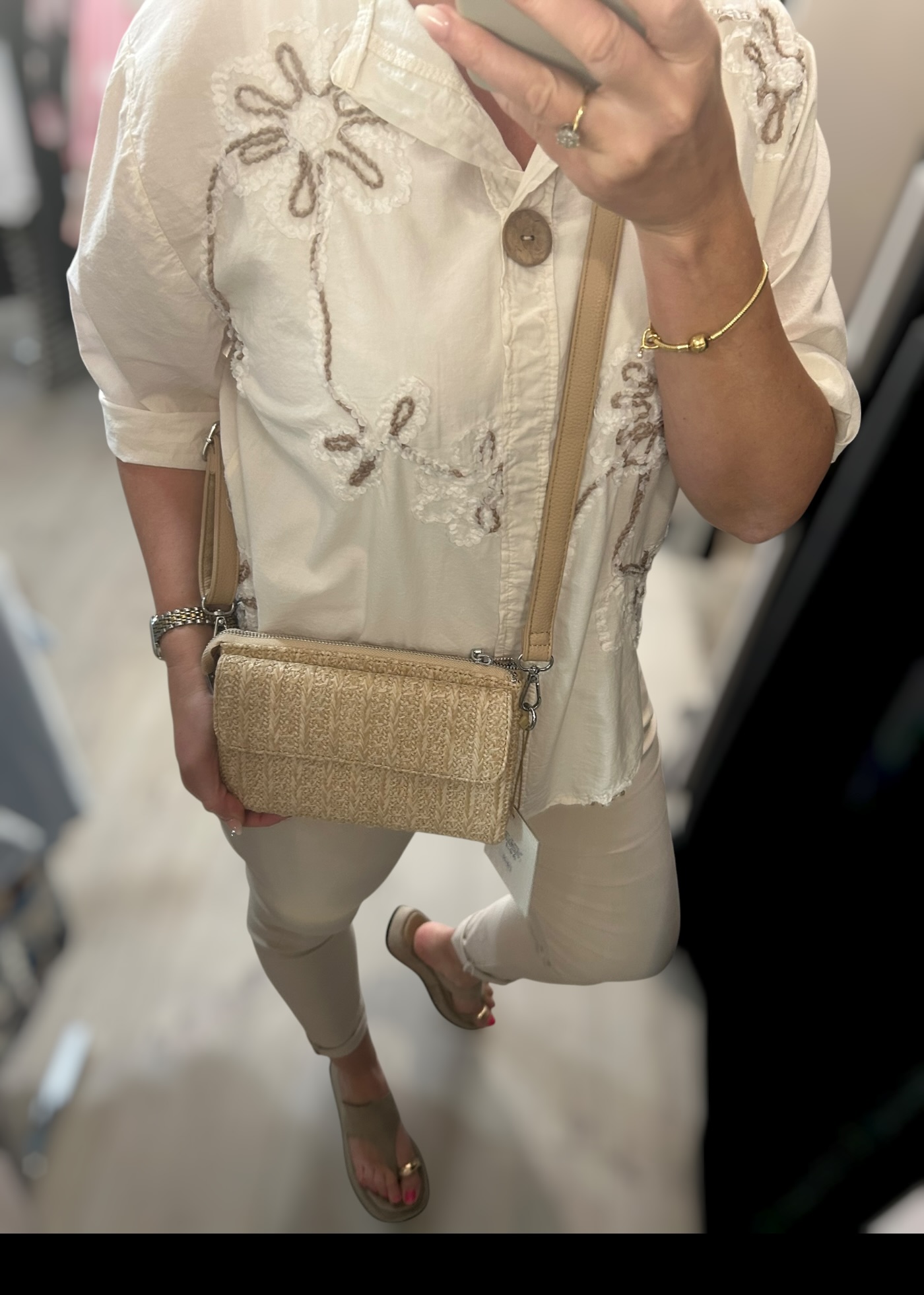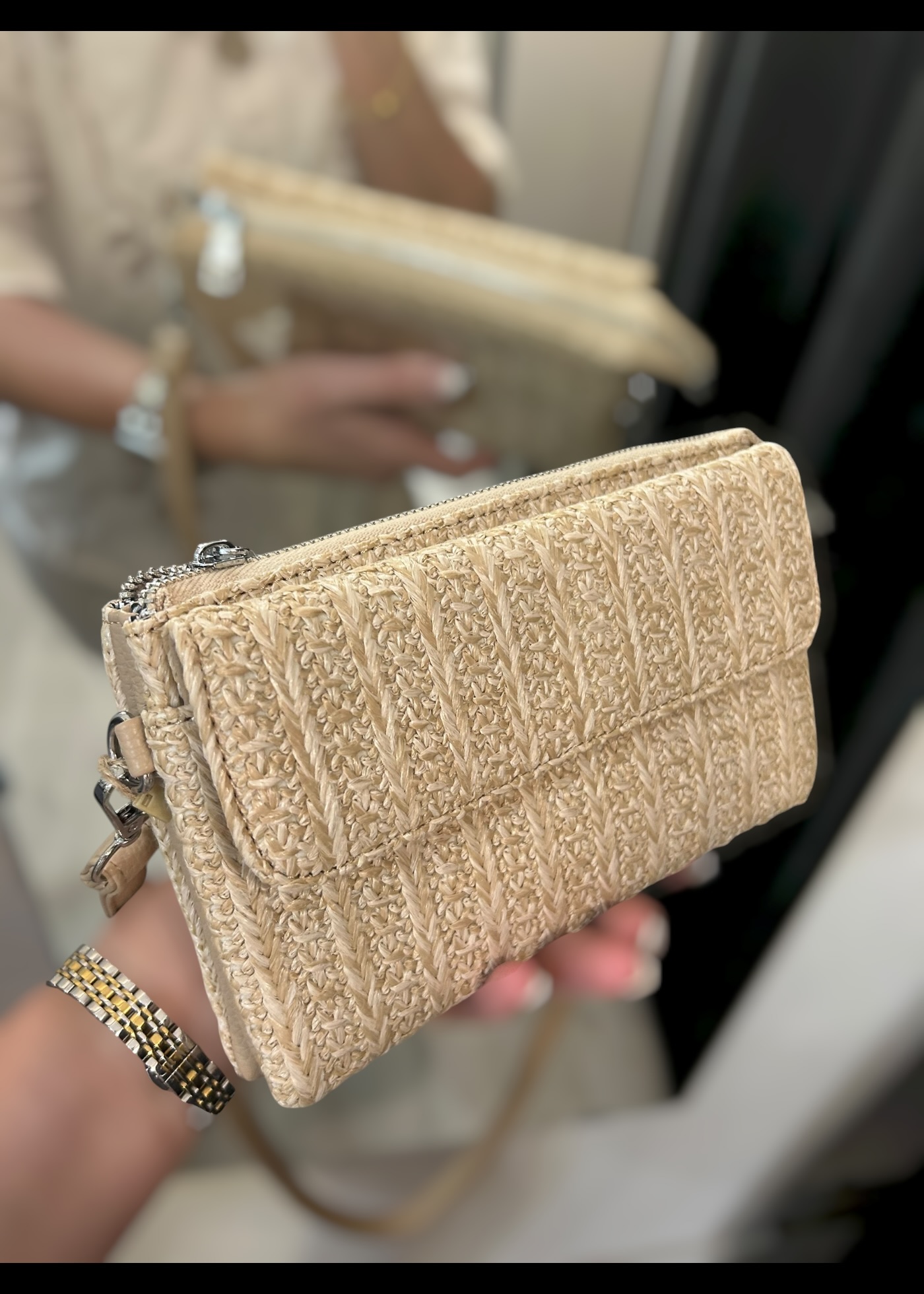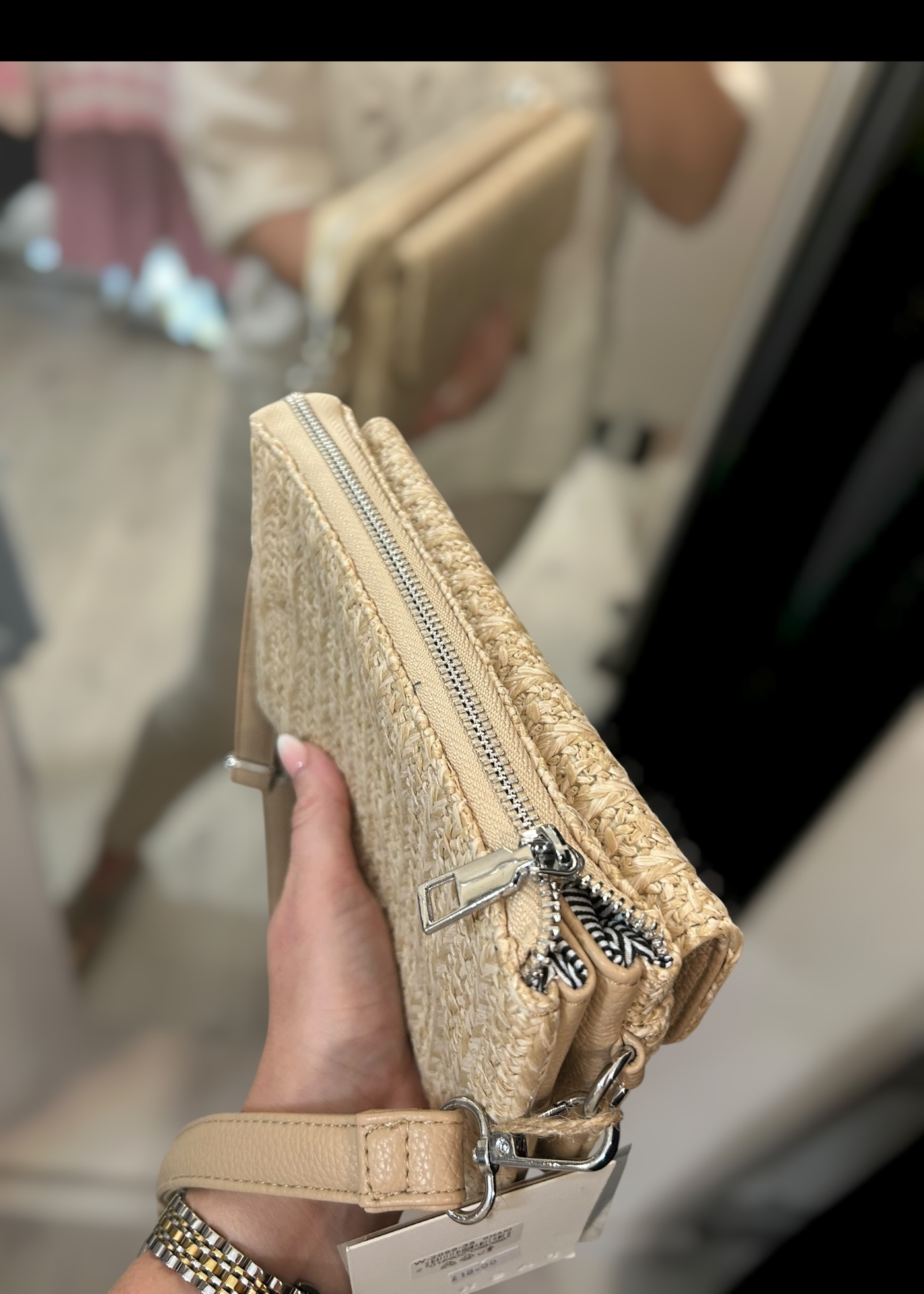Raffia style cross body bag with zipped compartment aswell as flap compartment to front