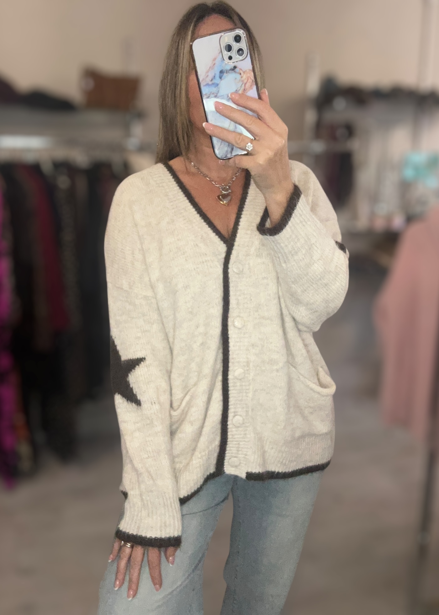 Slouchy fit cream cardi with brown trim and star detail to back and elbows