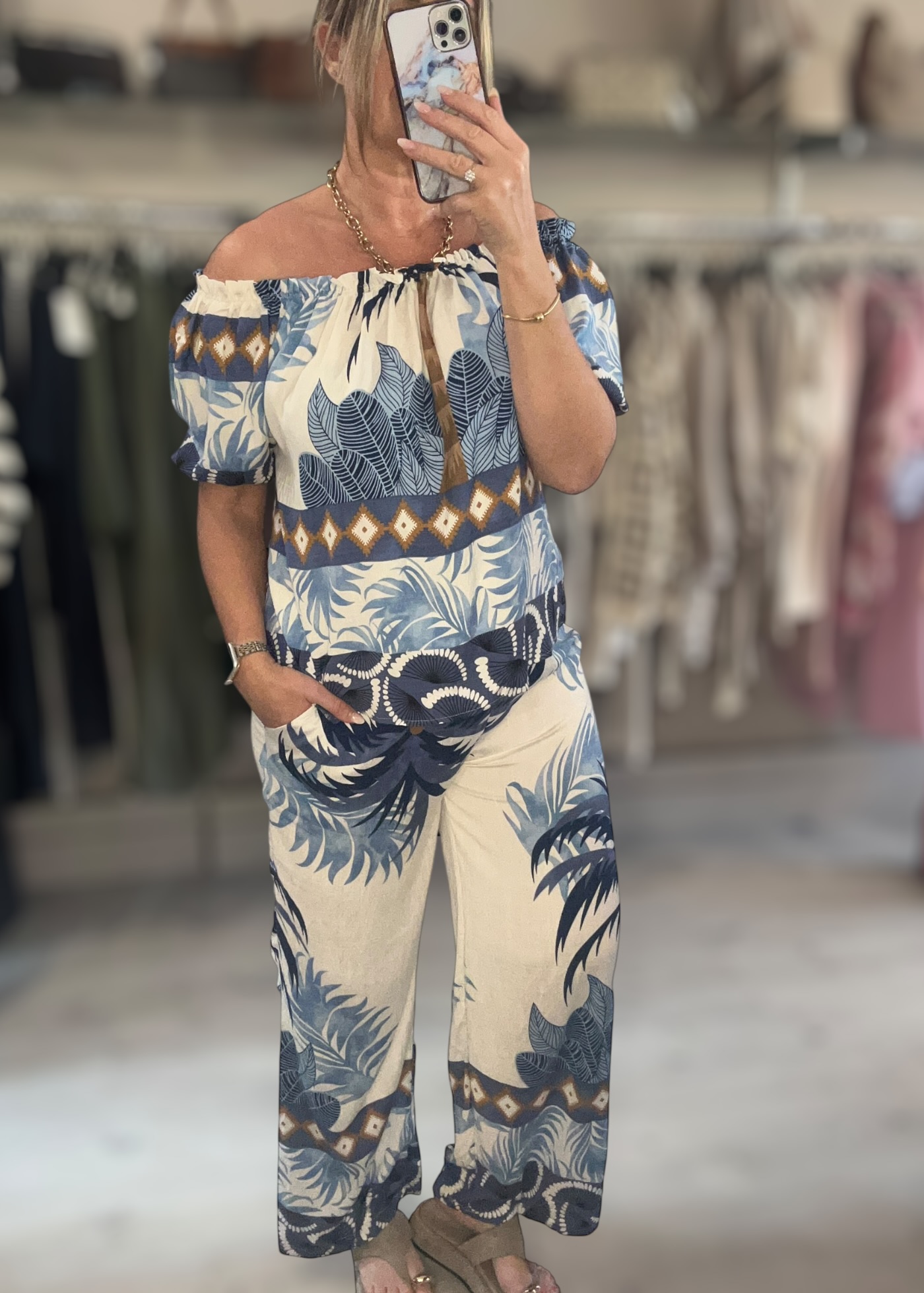 stretched neckline printed top and matching printed trousers with stretch tie waist and pockets