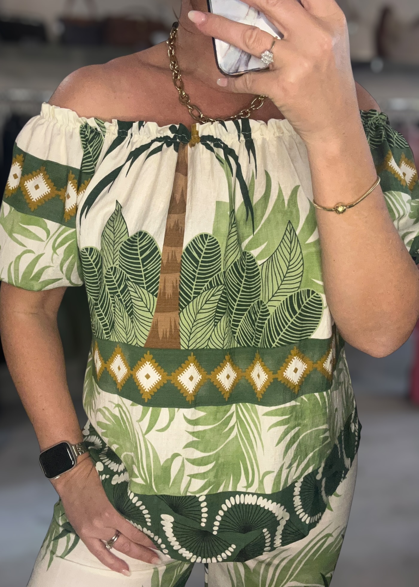 stretched neckline printed top and matching printed trousers with stretch tie waist and pockets