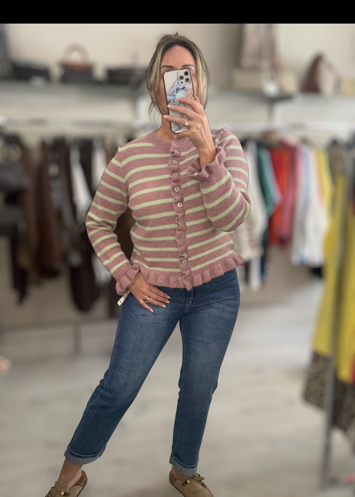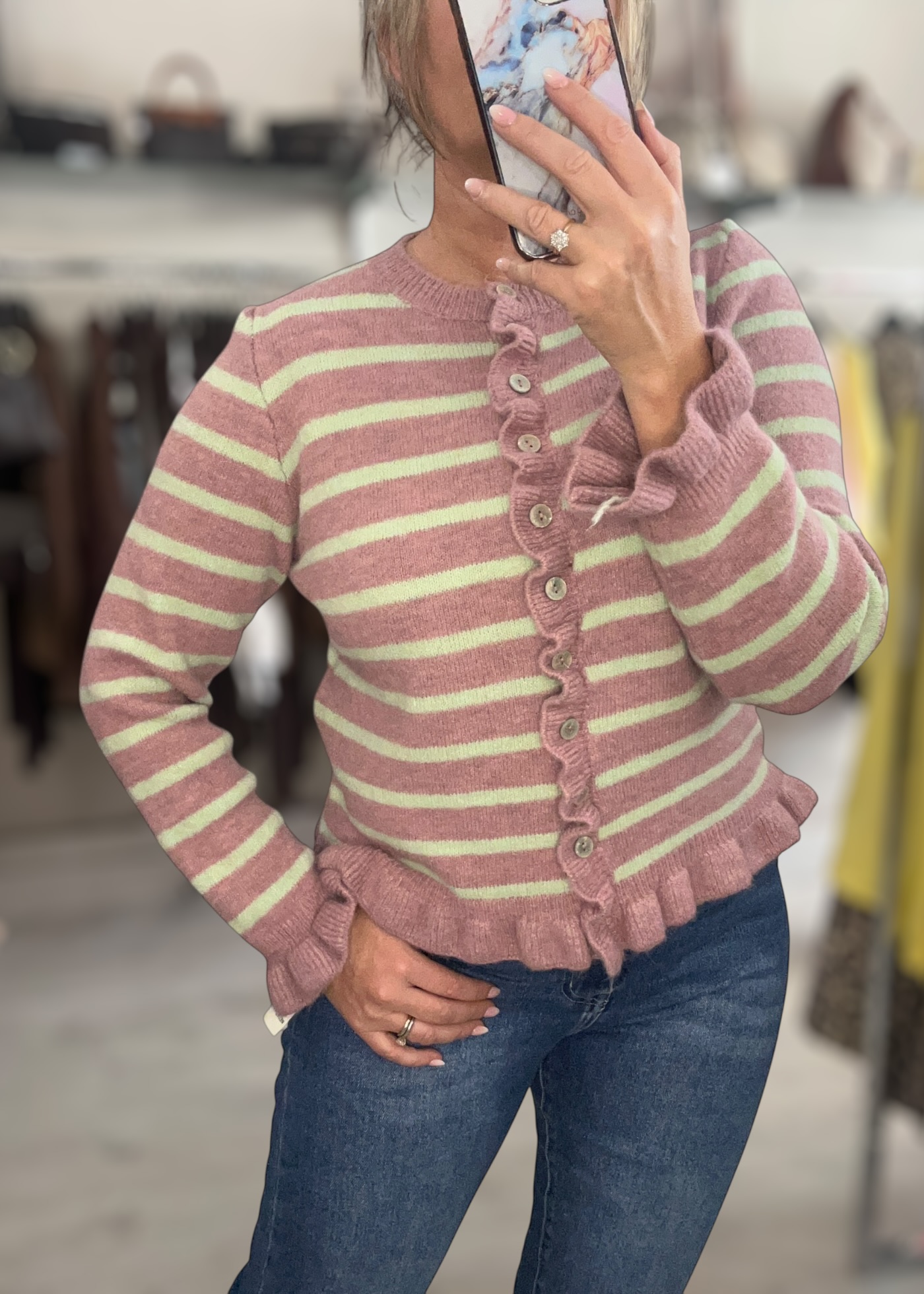 Soft button front stripe knit cardi with frill